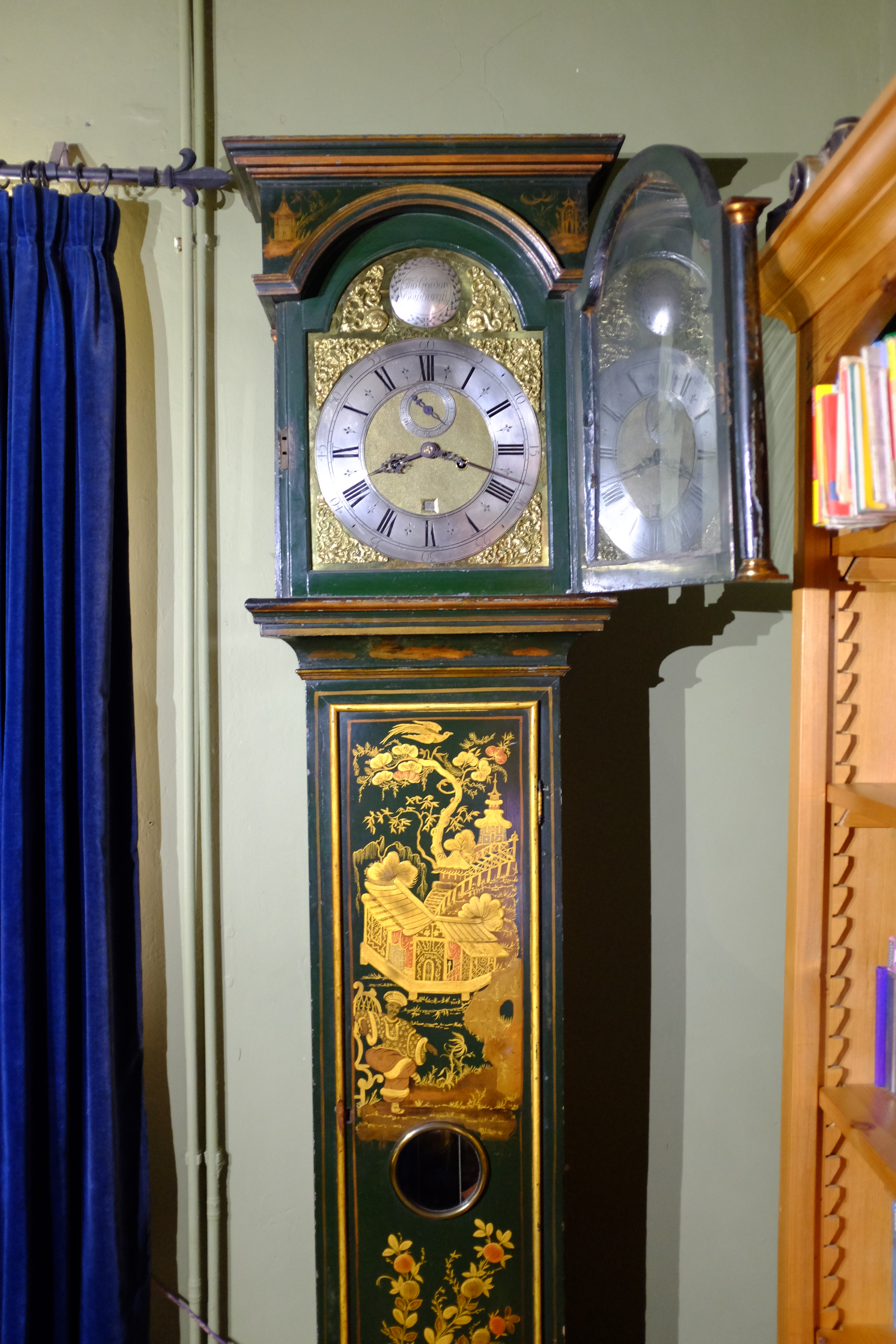 This clock was in the National Trust’s Georgian House, in the main bedroom for many years. Visitors to Edinburgh would come and visit it, in its rather incongruous position. It is now installed in the drawing room of a 17c Welsh farmhouse, and very happy in its new surroundings. The chinoiserie panels and elegant silver gilt frame are entirely suitable for a family with ambitions to advance in commerce.