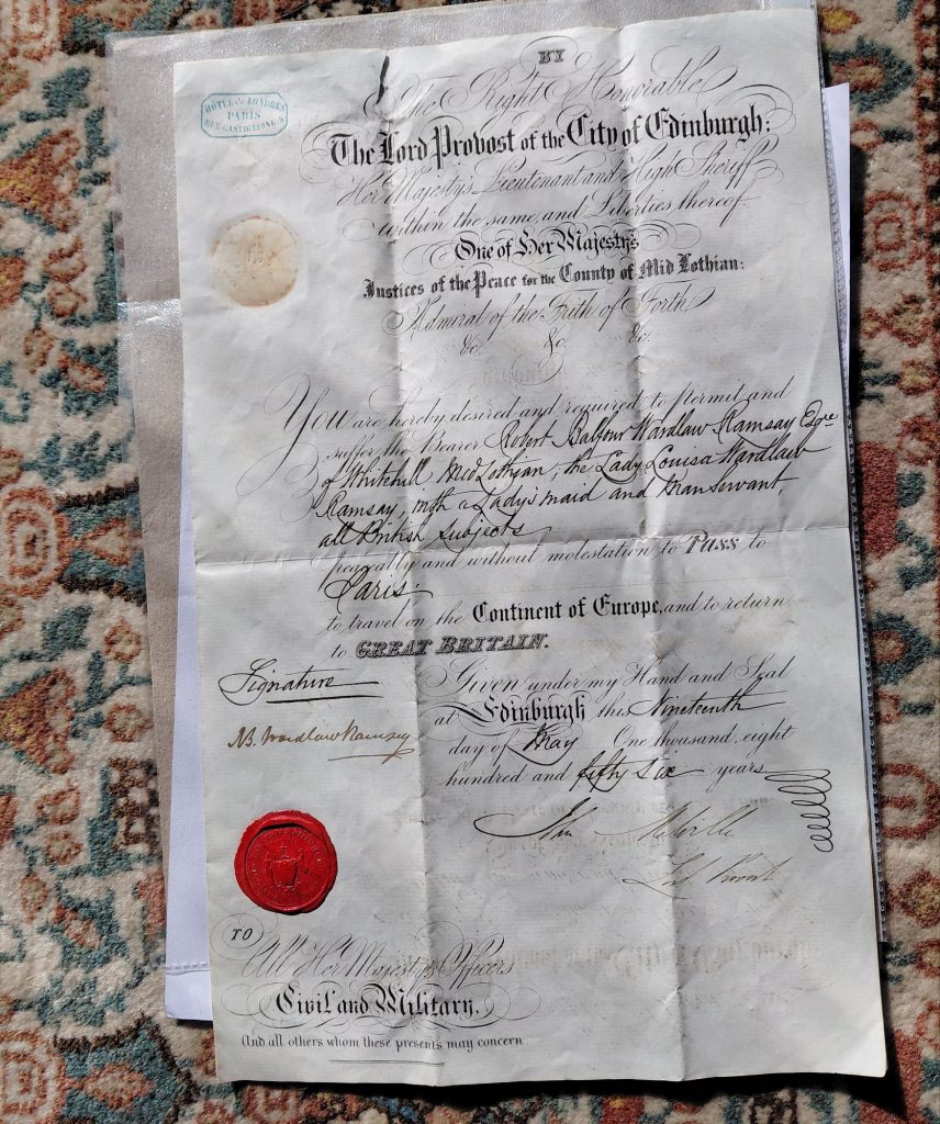 Lady Louisa Jane Hay was the third daughter of George, 8th Marquis of Tweeddale. The Hay girls were considered exceptionally fertile, and all made good marriages. Louisa married Robert Balfour Wardlaw Ramsay in 1841, and the couple went on several trips around Italy, along with lady’s maid and manservant, as listed in this passport dared 1857.