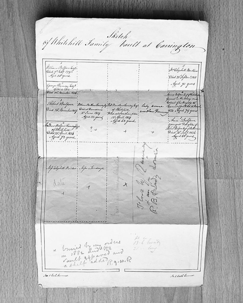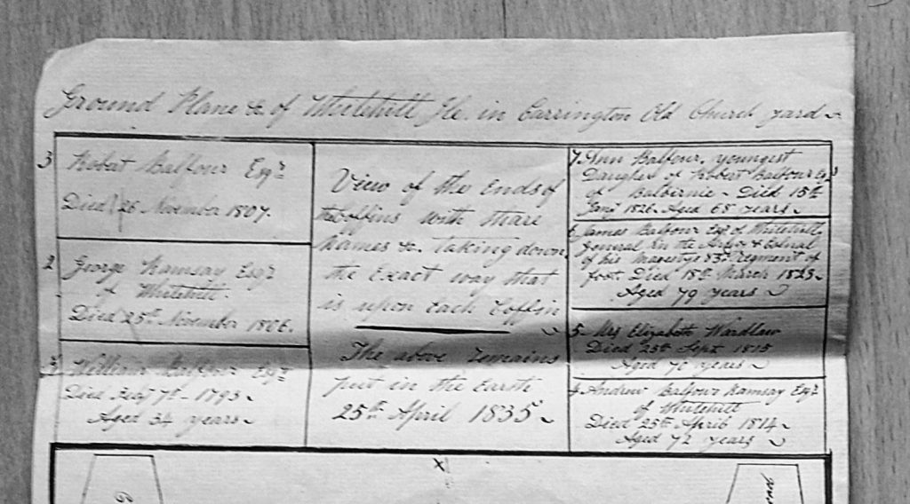 The vaults were opened in 1835, presumably in anticipation of Robert Wardlaw Ramsay’s death in April 1836, and again in 1882, when Robert Balfour tried to bring order to the space by burying a number of coffins in the ground. These are marked X and they include his mother, father, aunt, brother, cousin and daughter.